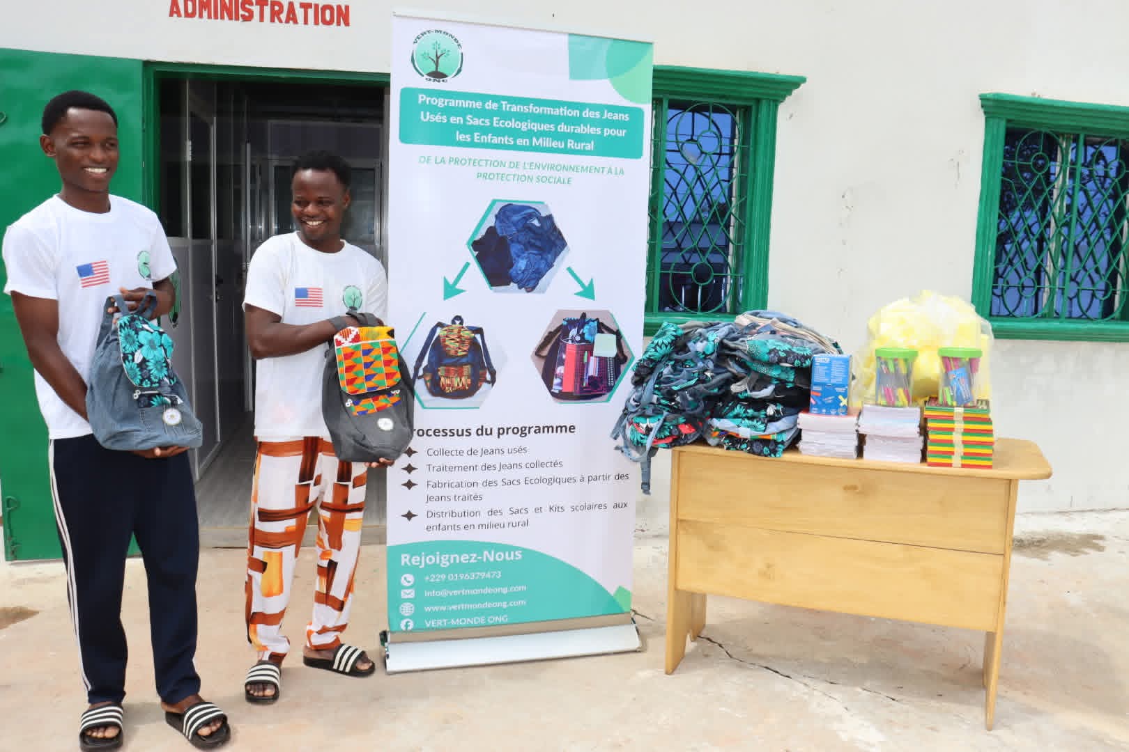 Les premières cohortes de jeunes formés, issues du quartier Okedama à Parakou, avaient mis en œuvre une activité assez particulière. Ils ont contribué à la transformation des jeans usés en sacs d’écoliers écologiques. Au début de cette année scolaire 2025-2026, ces sacs écologiques, en plus des kits scolaires (cahiers, ardoises, stylos, craies, chiffons) ont été distribués aux 50 enfants commençant leur première année du primaire (CI) à l’Ecole Primaire Publique de Karo dans le village Karo au Nord Bénin. Ces sacs et kits scolaires permettront à ces enfants de bien commencer leur année scolaire. Par cette donation, les parents aux revenus modestes pourront faire des économies sur les dépenses scolaires et éventuellement investir ces économies dans leurs activités génératrices de revenu. A travers cette action, le programme de formation des jeunes sur le volontariat est passé de la protection de l’environnement (recyclage des jeans) à la protection sociale (distribution de kits scolaires). Comme le confirment de nombreuses études scientifiques, la protection sociale est indispensable à toute nation, surtout celles à faible revenu comme le Bénin.